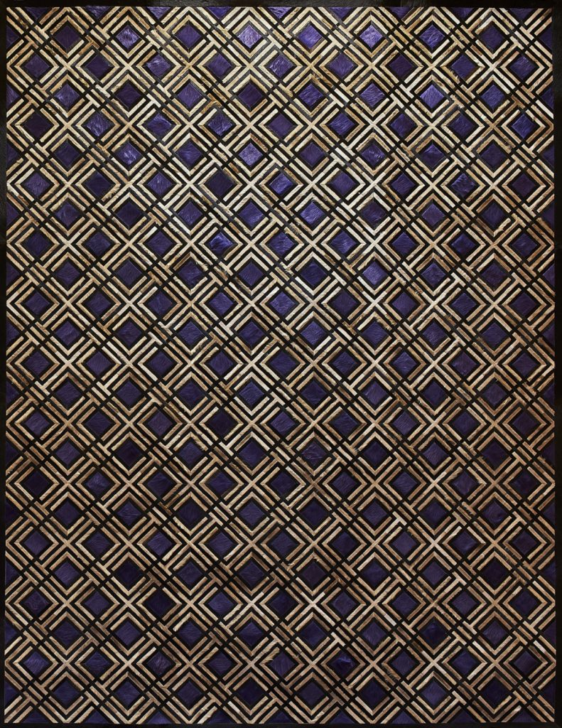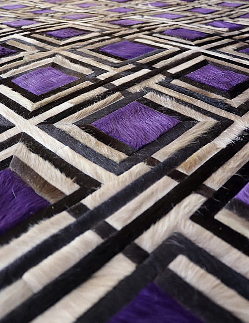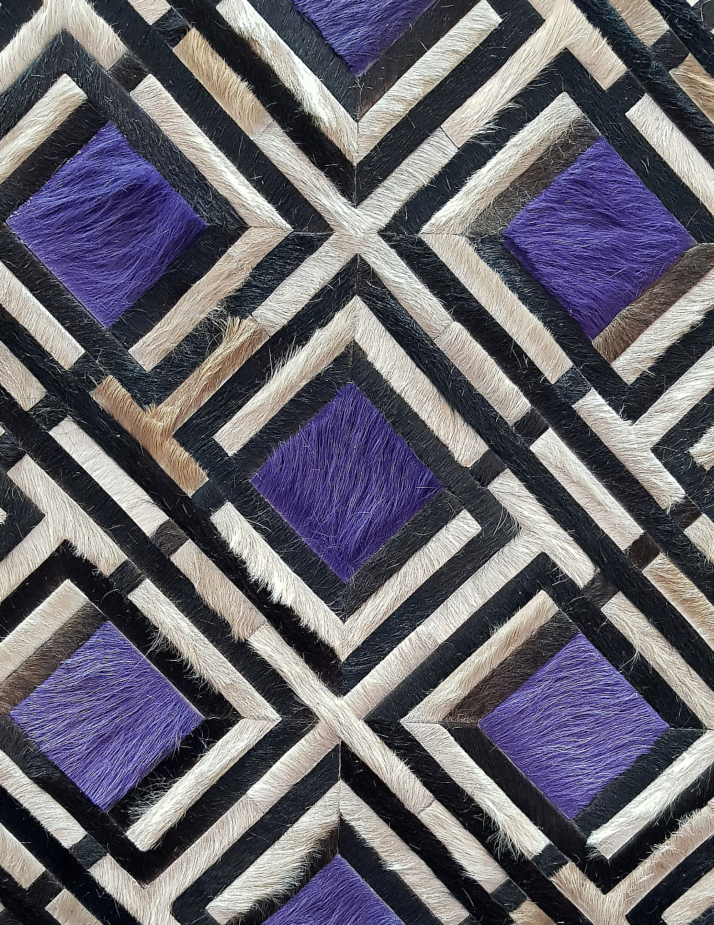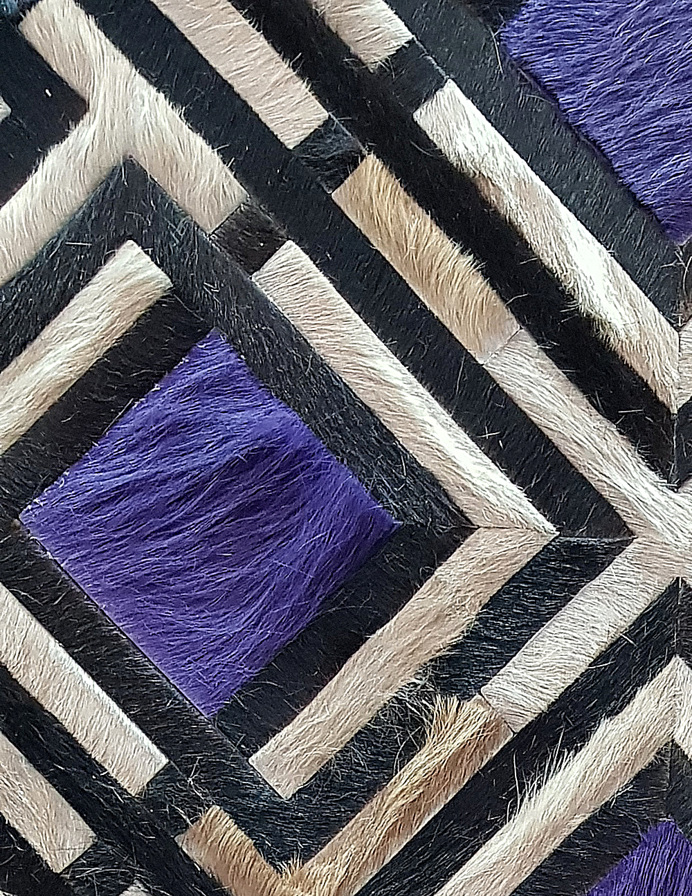 | Description | Natural Hair on Leather Of 1719 pieces | Size | Diam. –9.5 x 12.5ft / 289 x 381cm | Shape | Rectangle | Colors | Black – Beige- Purple |